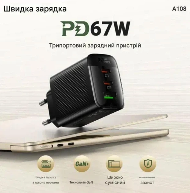 Мережевий зарядний пристрій AceFast A108 GaN PD67W з технологією швидкого заряджання