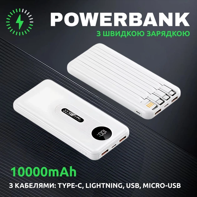 Павербанк зі швидкою зарядкою 10000мАг, Powerbank з вбудованими кабелями Type-C Lightning MicroUSB USB Powerbank9White