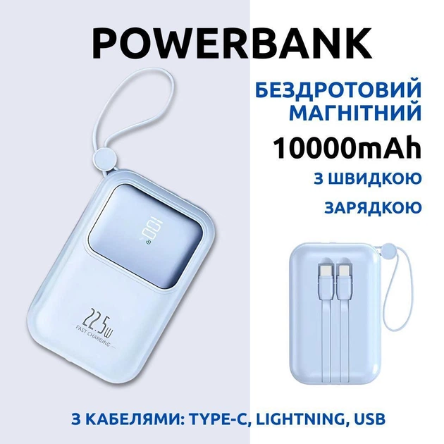 Павербанк бездротовий магнітний 10000мАч, Powerbank з кабелями Type-C/Lightning/USB, 22.5W Blue 5069463