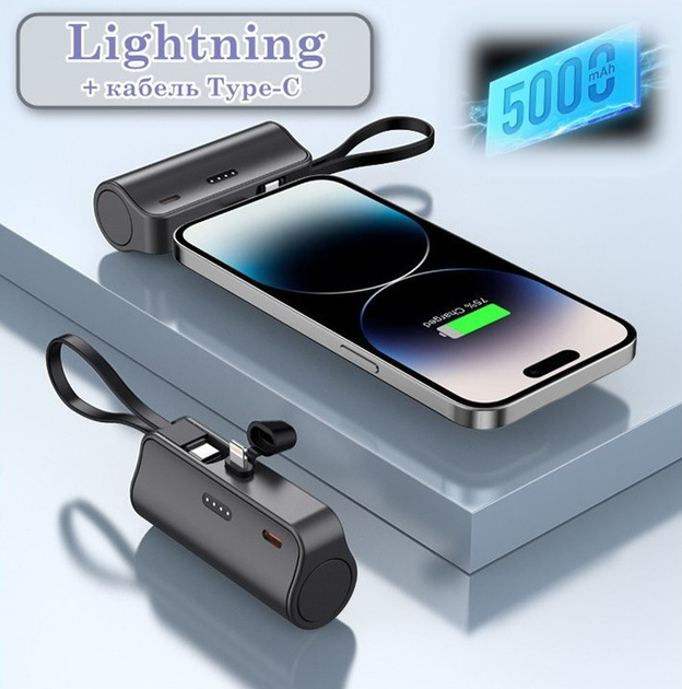 Портативний акумулятор міні Power Bank 5000 mAh 18.5Wh Lightning + кабель Type-C Black