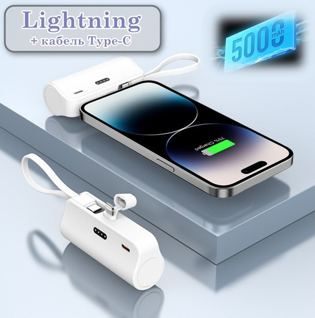 Портативний акумулятор міні Power Bank 5000 mAh 18.5Wh Lightning + кабель Type-C White