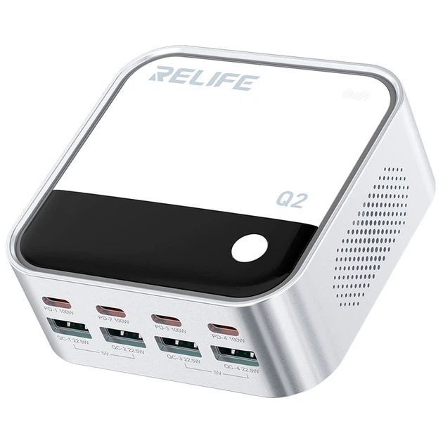 Швидкий зарядний пристрій Relife Q2 GaN / 4xUSB QC / 4xType-C PD / RGB підсвітка / 120W Max / Silver