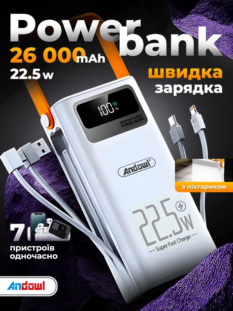 Повербанк умб 26000 mah 22.5w зі швидкою зарядкою ліхтариком дисплеєм Andowl Q-XD7X1 павербанк для телефону роутера пристрої