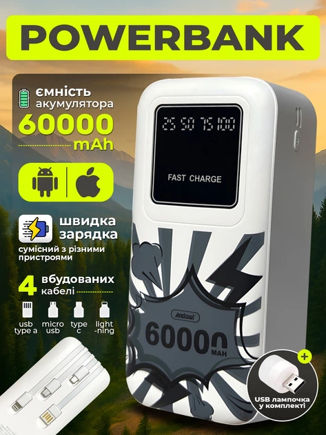 Повербанк умб 60000 mah QC 3.0 PD Andowl Q-CD212X1 білий з ліхтариком дисплеєм для ноутбука телефону роутера зовнішній акуму