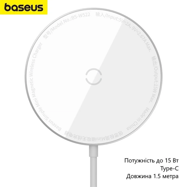 Бездротова зарядка Baseus Mini (для смартфонів серії iPhone 12, потужність до 15 Вт, Type-C, довжина 1.5 метра) - Білий