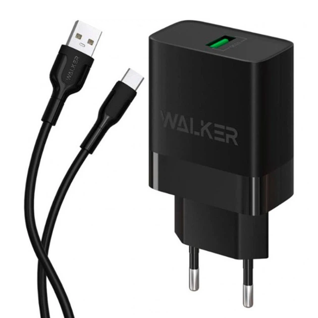 Мережевий зарядний пристрій (адаптер) 2в1 WALKER WH-35 1USB QC3.0 3A 18W + Data Cable USB to Type-C чорний