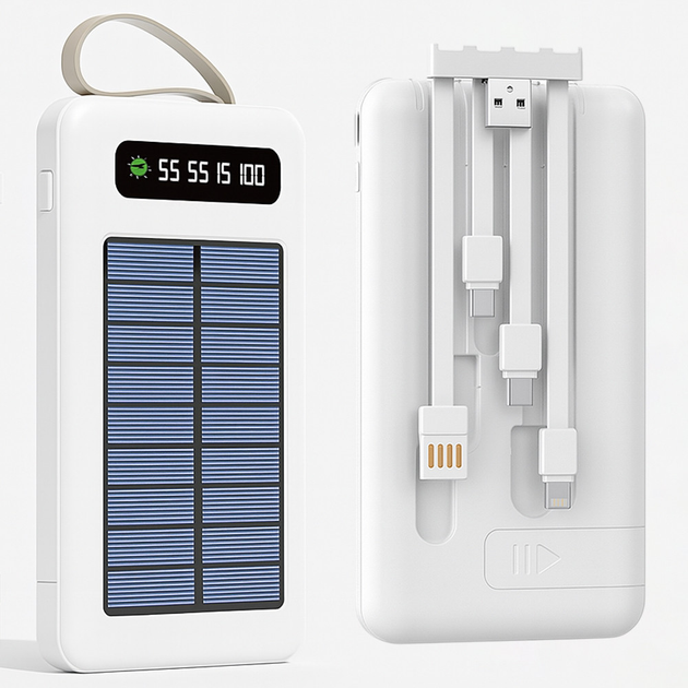Power Bank із сонячною панеллю 10000мАч білий портативний зарядний пристрій із 4 перехідниками для гаджетів