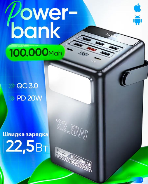 Повербанк Hoco 100000 mAh зі швидкою зарядкою 22.5W power bank портативна батарея з ліхтариком, ART D0B3