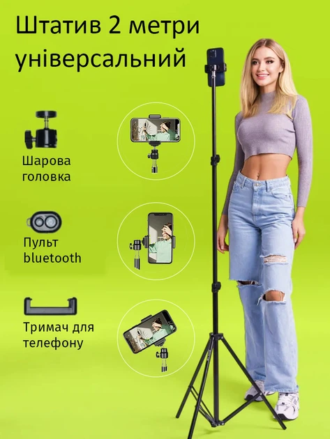 Штатив для телефону універсальний 2 метри із Bluetooth кнопкою. Для телефону, камери, лампи, світла