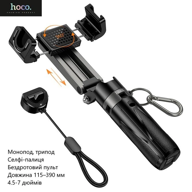 Штатив для смартфону Hoco K27 (монопод, трипод, селфі-палиця, бездротовий пульт, поворот 360°, довжина 115–390 мм) - Чорний