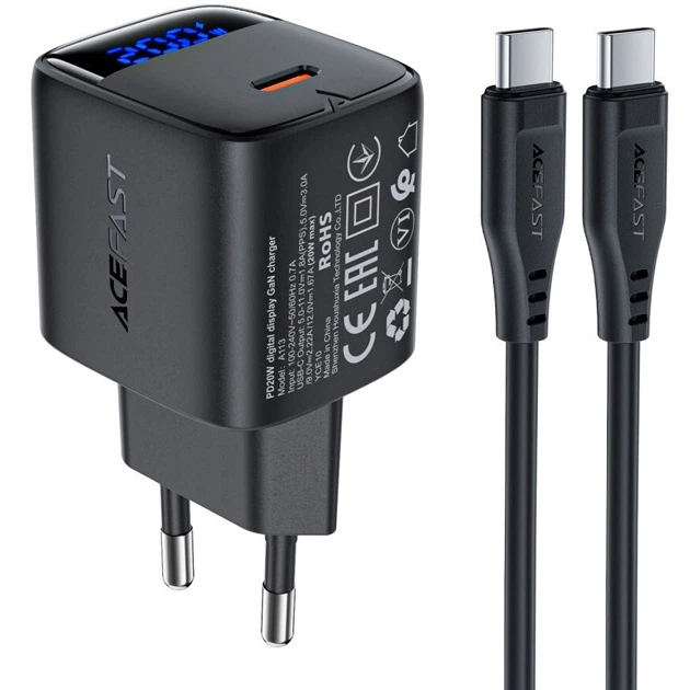 Зарядне мережеве ACEFAST A113 PD20W (Type-C) для пристроїв Android + кабель Type-C - Type-C Чорний