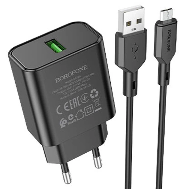 Зарядне мережеве BOROFONE AS72A USB QC3.0 + кабель USB to Micro-USB для пристроїв Чорний