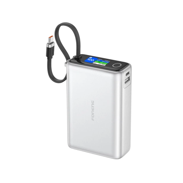 Повербанк 30000 mAh 65W для ноутбука Foneng PX128 с LED дисплеем и быстрой зарядкой PD/QC USB-C порт встроенный кабель Type-