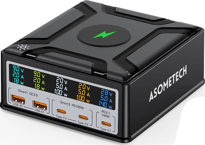 Мережевий зарядний пристрій Asometech 140W (2 USB + 3 Type-C) з дисплеєм