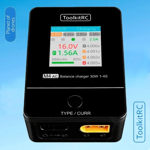 Зарядний пристрій ToolkitRC M4AC 25W AC, XT60 – Розумна зарядка для акумуляторних батарей LiPo, LiHV, LiFe 1-4S