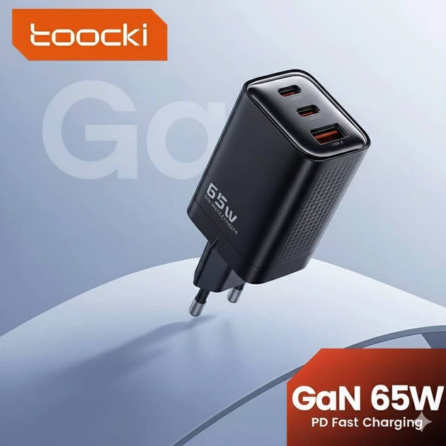Швидка Зарядка Toocki GaN 65W 1USB + 2Type-C Black PD3.0 QC Мережевий зарядний пристрій