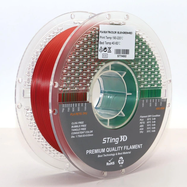 Пластик для 3d друку Sting 3D PLA Silk Tri-color Червоний+Золотий+ Зелений 1кг