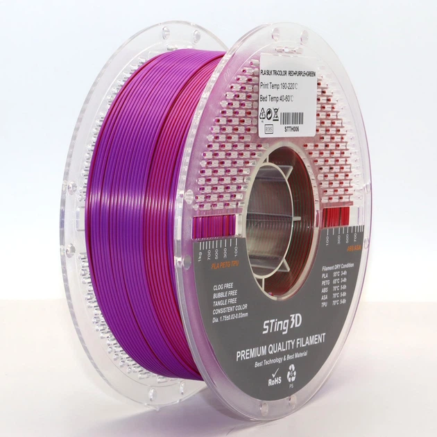 Пластик для 3d друку Sting 3D PLA Silk Tri-color Червоний+Пурпуровий+ Зелений 1кг