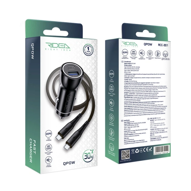 Автомобільний Зарядний Пристрій Ridea RCC-30114 QPow 1USB/1USB-C PD/QC 30W+Type-C to Type-C Колір Чорний