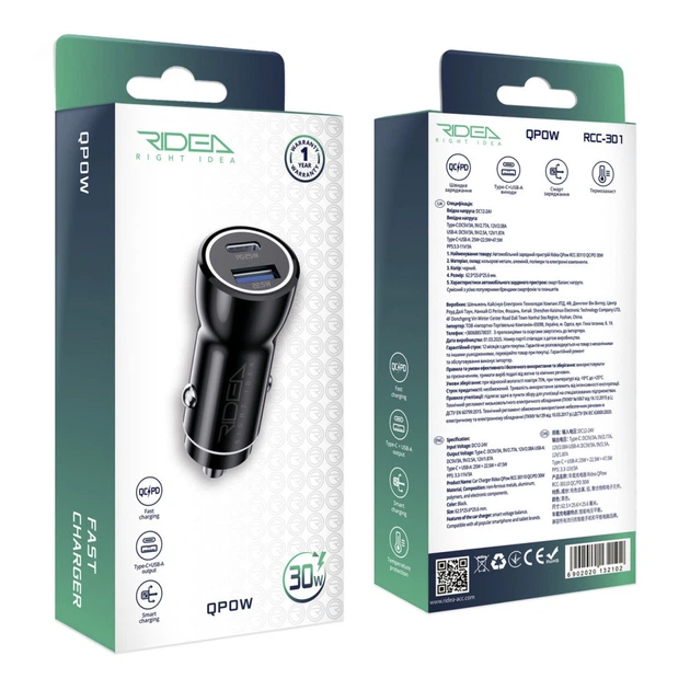 Автомобільний зарядний пристрій Ridea RCC-30110 QPow 1USB/1USB-C PD/QC 30W Колір Чорний