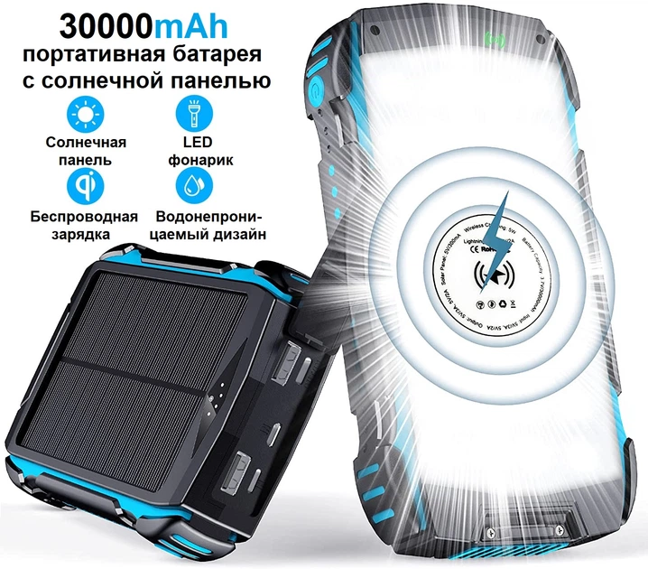 УМБ із сонячною панеллю та кемпінговим ліхтарем на 28 LED VHG DN50 30000 mAh Wireless Solar Power Charger Blue