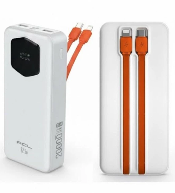 Зовнішній акумулятор повербанк Power bank ACL PW-140 20000 мАг швидка зарядка вбудовані кабелі Білий