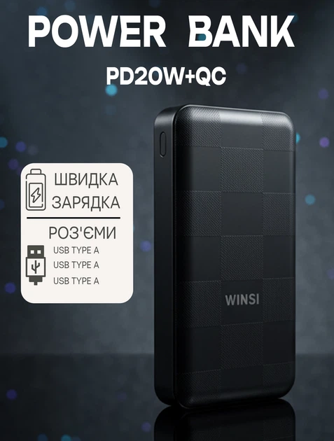 Повербанк 20000mAh WINSI PD20W+QC3.0 із швидкою зарядкою Чорний