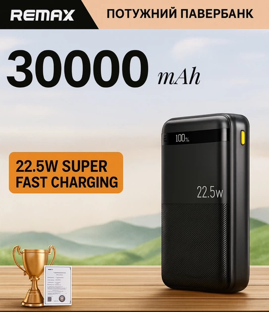 Павербанк 30000 mAh 22,5W PowerBank із швидкою зарядкою Remax Digital Display Портативний акумулятор зовнішній акумулятор 2U