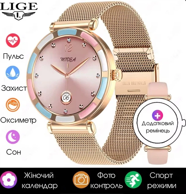 Смарт-годинник жіночий Lige P61 Gold (розмова, пульсоксиметр) 2 ремінці Amoled екран