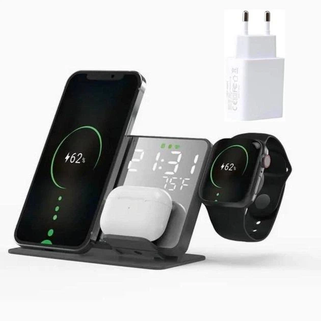 Бездротова зарядка стенд (зарядна станція 4 в 1) DK Smart Mirror 4 in 1 Fast 15W gray + адаптер живлення