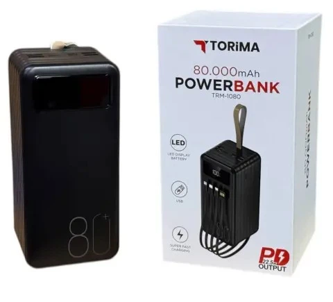 Павербанк-гігант Torima TRM-1080: 80000 мАг, швидка зарядка, ліхтар та повний набір кабелів