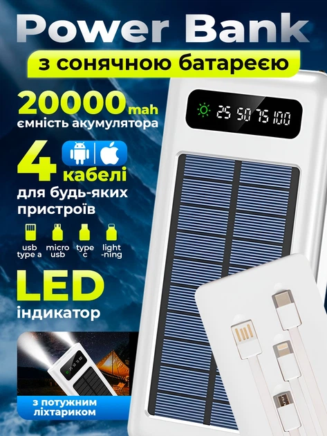 Повербанк умб 20000 mah з сонячною батареєю ліхтариком FOYU FO-9003 павербанк для телефону смартфону пристроїв powerbank з в