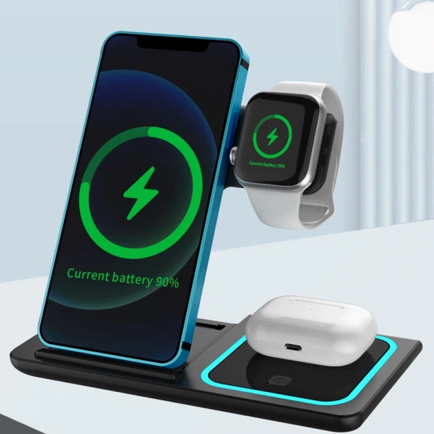 Бездротовий зарядний пристрій USB Type-C 3в1 15Вт чорний ABS-пластик для універсальної зарядки смартфонів