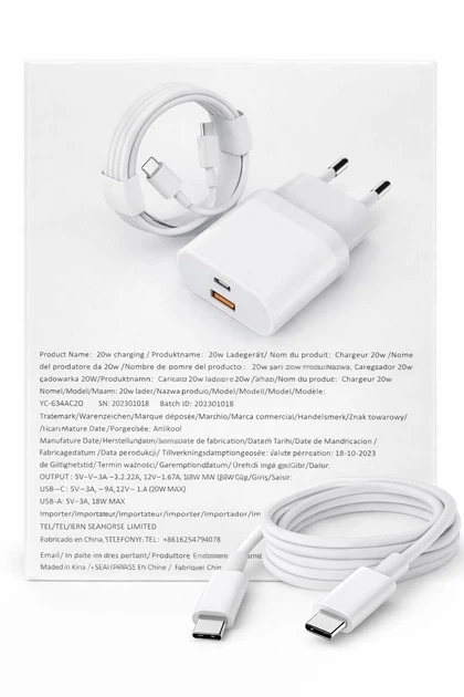 Мережевий зарядний пристрій USB-C 20 Вт з кабелем USB-C — GOLDEN SEAHORSE YC-634AC20, білий