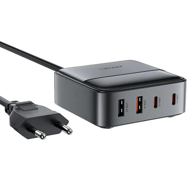 Багатопортовий зарядний пристрій 65 Вт GaN з LED-дисплеєм, 2xUSB-C, 2xUSB-A, 1.5 м, сірий