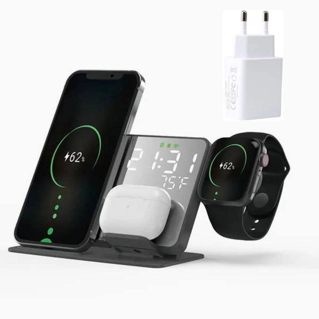 Бездротова зарядка стенд Smart Mirror 4 in 1 Fast 15W чорна + Блочок 3А