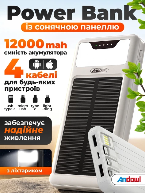 Повербанк умб 12000 mah з сонячною батареєю ліхтариком Andowl power bank Q-DC79X1 для телефону роутера пристроїв powerbank з