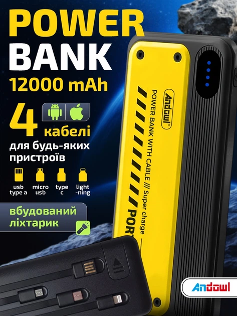 Повербанк умб 12000 mah з вбудованими кабелями type c lightning micro usb a та ліхтариком Andowl power bank Q-DC98X1 для тел