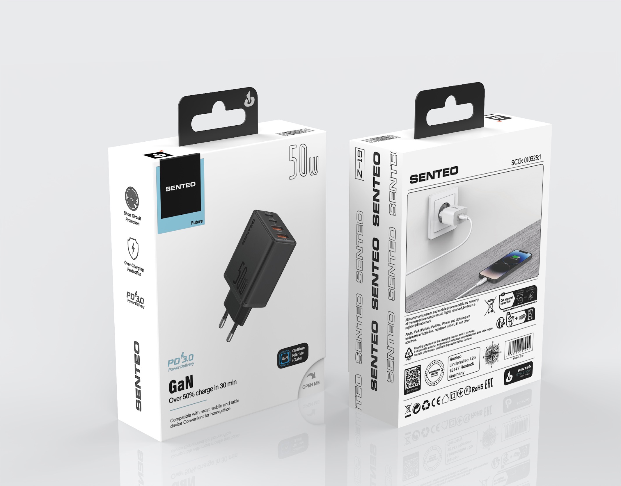 Мережевий Зарядний Пристрій 2Type-C+2USB Senteo Z-19 GaN2 50W Black