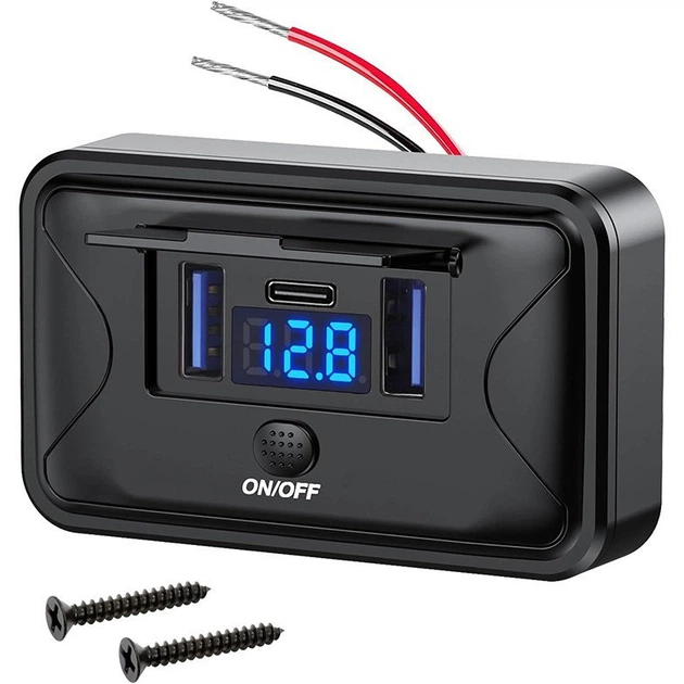Накладна зарядка з кнопкою авто для телефону, 2 USB + PD Type-C + Вольтметр, 12-24В, QC 3.0 (швидка зарядка), Синя