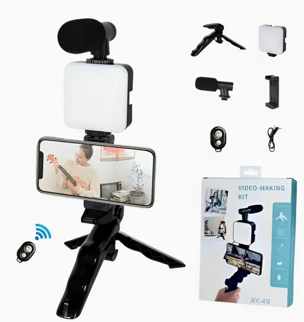 Набір блогера трипод для телефону AY-49 з LED підсвічуванням та пультом, з тримачем та мікрофоном для селфі