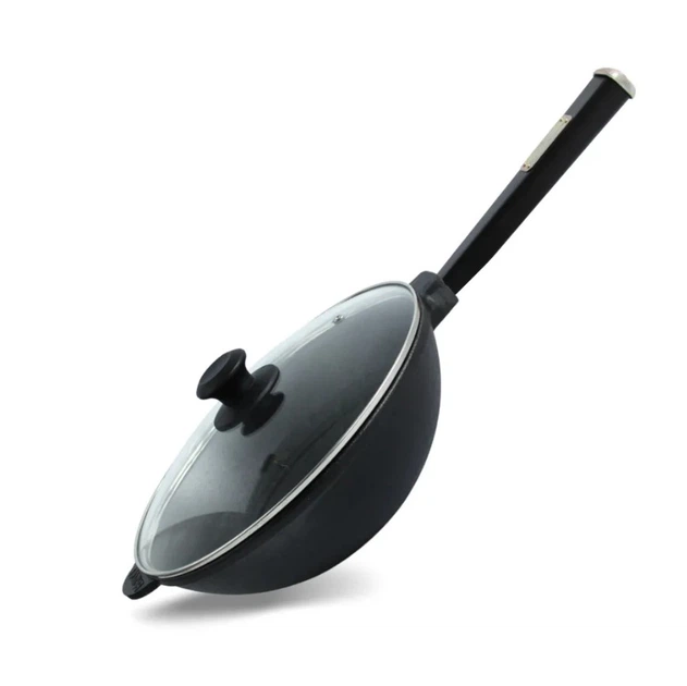 Сковорода чавунна WOK Brizoll 26см зі скляною кришкою та дерев'яною ручкою Black 2,8 л