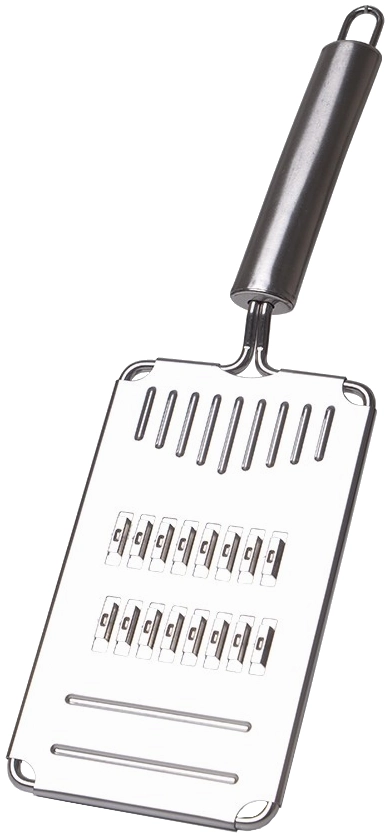 Терка FISSMAN Терка на ручці FISSMAN розміром 28,5×9 см призначена для зручного та швидкого подрібнення овочів, фруктів, сиру та інших продуктів. Робоча поверхня має гострі сталеві леза, які забезпечують чистий і рівномірний зріз без зайвих зусиль. Подовжена ручка зручна в триманні та дозволяє легко контролювати процес, роблячи роботу безпечнішою та комфортнішою. Особливості Корпус