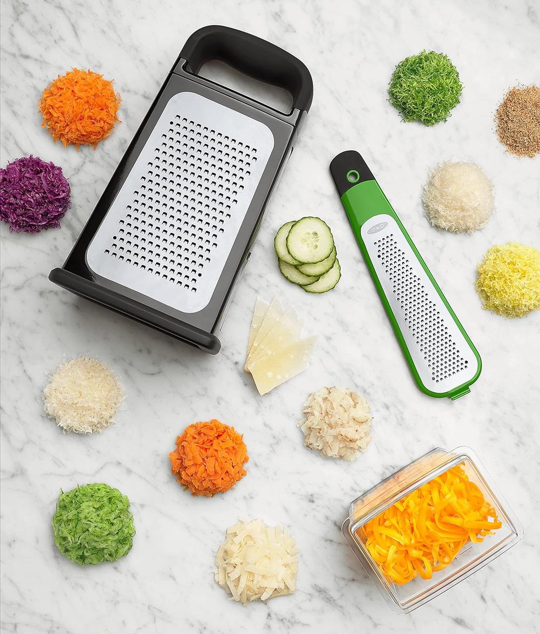 Подрібніть овочі, спеції, шоколад та тверді сири середнього розміру для додавання до рецептів або прикраси страв та десертів за допомогою середньої тертки OXO Good Grips. Характеристика: довжина 30 см Переваги: Матеріал: нержавіюча сталь, пластик Кожна сторона тертки має різну поверхню: середня тертка, велика тертка, скибка і знімна цедра Кутовий ніж для рівного зрізу Зручний знімний контейнер у комплекті Знімну частину для цедри можна використовувати безпосередньо над тарілкою Можна мити в посудомийній машині для легкого та зручного очищення