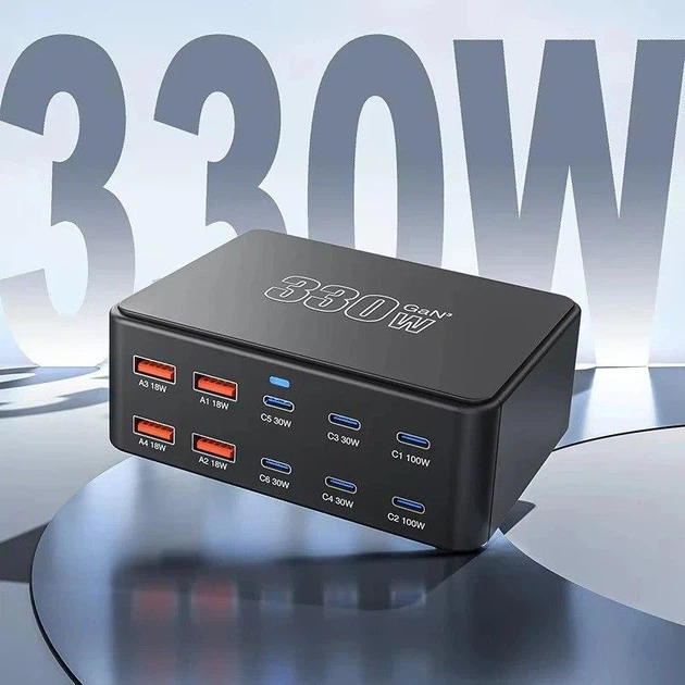 Настільний мережевий зарядний пристрій 330W 10 портів GaN МЗП Швидка зарядка блок швидкої зарядки блочок 4х USB QC 60W MAX,