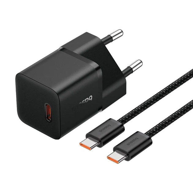 Адаптер мережевий Baseus GaN5 Fast Charger (mini) |1Type-C, 20W/3A, PD/QC| (With C to C 100W 1m cable) Black