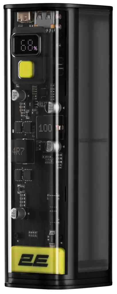 Ємність 24 000 мА·год / 88 Вт ч Вхід USB-C: 5 В 3A / 9 В 3A / 12 В 3 A / 15 В 3 A / 20 В 3,25 A Вихід USB-C: 5 В 3A / 9 В 3A / 12 В 3 A / 15 В 3A / 20 В 5 A Вихід USB-А: 5 В 3A / 5 В 4,5 A / 9 В 2 A / 12 В 1,5 A Вихід загальний 100 Вт Вхід загальний 65 Вт Розмір 44 × 145 × 57 мм Прозорий корпус портативного зарядного пристрою Power Bank 2E Сrystal у стилі кіберпанк знаменує нову еру зовнішніх акумуляторів. Сrystal може швидко, безпечно та надійно