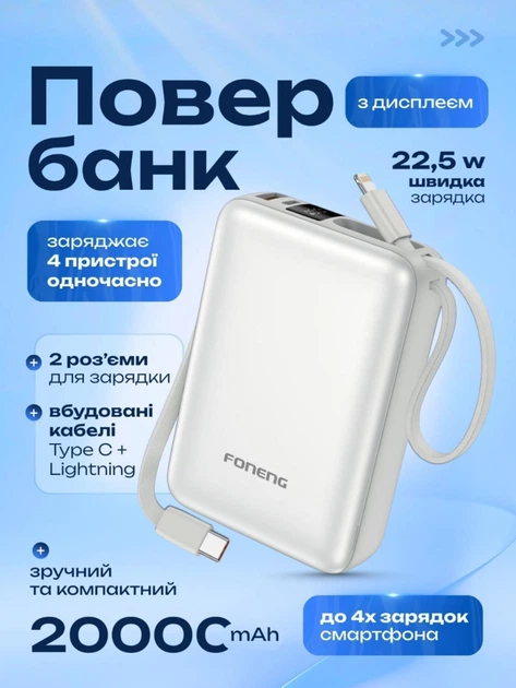Повербанк 20000 mAh 22.5W Foneng PX116 з LED дисплеєм і швидким заряджанням PD/QC USB-C порт вбудований кабель Type-C lightn