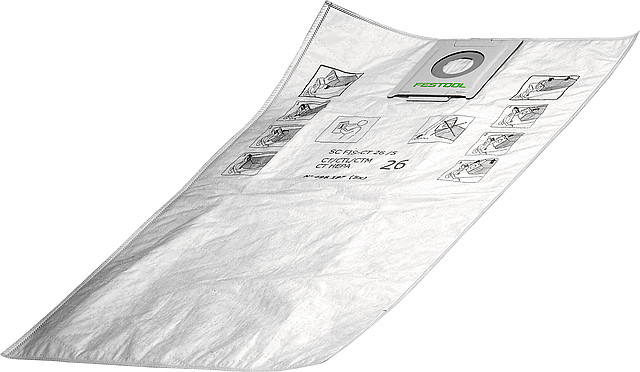 Мішок-пилозбірник SELFCLEAN SC FIS-CT 26/5 Festool 496187 ПІДХОДИТЬ ДЛЯ НАСТУПНИХ МОДЕЛЕЙ ІНСТРУМЕНТА FESTOOL: пиловидальні апарати серії CT/CTL/CTM 26 КОМПЛЕКТ ПОСТАЧАННЯ: 5 штук в пакуванні. ОПИС: Для постійно високої інтенсивності всмоктування. Високоякісний мішок-пилозбірник із флісу, самостійно видаляє пилові відкладення всередині мішка-пилозбірника. При включенні пиловидального апарату мішок-пилозбірник Selfclean надувається, а при вимиканні стискається. При цьому відкладення пилу відокремлюються від стінок мішка-пилозбірника Selfclean. Для збереження чистоти та підтримки високої інтенсивності всмоктування. Системний підхід для ефективної, чистої та безпечної для здоров'я роботи. Пилозбірник з нетканого матеріалу Самостійно видаляє пилові відкладення Оптимальне використання об'єму мішка-пилозбірника Підходить для сухого видалення пилу Повне використання об'єму мішка-пилозбірника SELFCLEAN та постійно висока потужність всмоктування З сертифікатом FSC™ Технічні особливості SC FIS-CT 26/5 Відповідальне лісокористування Целюлоза отримана з деревини, заготовленої з урахуванням принципів раціонального та контрольованого лісокористування, і тому виріб позначено знаком Лісової опікунської ради (FSC™), що означає, що кожен етап ланцюжка постачання деревини має сертифікат FSC.