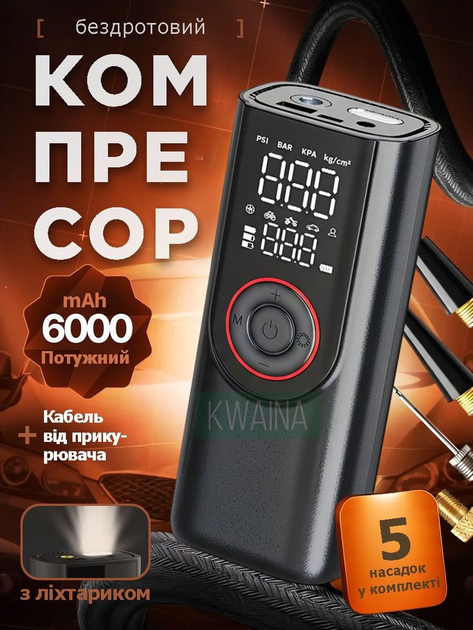 Портативний автокомпресор для шин, акумуляторний насос із ліхтариком, цифровий манометр, 80 Вт, 6000 мА/год, чорний